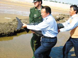 昨天上午10時(shí),記者聯(lián)系了膠南市漁政部門,該部門的曲站長(zhǎng)迅速趕到現(xiàn)場(chǎng),確認(rèn)這的確是一只小海豚,“海豚出現(xiàn)在淺海的現(xiàn)象很少見,最近幾年偶爾能在青島海域發(fā)現(xiàn)海豚!鼻鹃L(zhǎng)介紹說,“這只小海豚可能是跟媽媽出來捕食時(shí)被沖散的,及時(shí)將它放歸大海,母子應(yīng)該可以重逢!