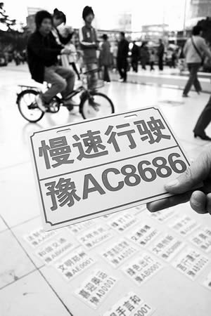 “禁走快車道豫AC0001”、“交通楷模豫AD0001”、“慢速行駛豫AC8686”……類似的個性車牌你見過嗎?昨日(2日)下午4時許,一男子的個性車牌在鄭州市二七廣場上一擺出,立刻吸引了不少路人的圍觀,“這都是你自己做的嗎?”“可以送給我嗎?”