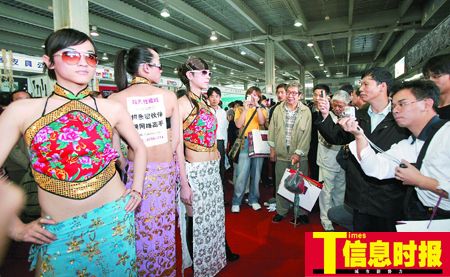 在昨天的展銷會上,一個位于“內(nèi)衣秀”表演舞臺一側(cè)、售賣各類“性知識教學片”的攤位吸引了大批市民的駐足。記者發(fā)現(xiàn),這些印有“廣東汕頭某出版社出版”的“教學教材”的光碟封面上,無論名稱、宣傳語和封面均十分露骨。當記者問及這些光碟是否正規(guī)出版物時,攤位的銷售人員表示這類光碟屬于正常的出版發(fā)行物,但只能針對成人銷售。