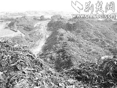 昨日上午,記者來到現(xiàn)場看到,掛著武漢牌照的多輛大貨車正不停地把垃圾倒在該村的地上。地上堆成了一個個小山坡,兩臺推土機在上面碾軋,現(xiàn)場發(fā)出陣陣惡臭。一名在現(xiàn)場指揮施工的男子告訴記者,是開發(fā)商叫他們往這里倒垃圾的。