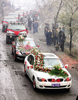兩輛豪華轎車(chē)帶著12輛悍馬組成的迎親車(chē)隊(duì)緩緩走在鄉(xiāng)間的路上,每經(jīng)過(guò)一個(gè)村莊就停下燃放鞭炮,路兩旁站滿了觀看的鄉(xiāng)親,比過(guò)年看紅火還熱鬧。11月12日,一場(chǎng)奢華的婚禮在太原河口鎮(zhèn)舉行。一對(duì)新人婚禮的宏大場(chǎng)面和巨額花費(fèi)震動(dòng)了周邊。