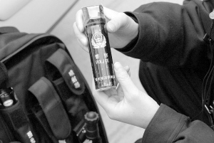 當(dāng)民警清查至酒店一個(gè)房間時(shí),房間內(nèi)的不法人員拒不開(kāi)門接受檢查,并堵在房門處將門反鎖,民警幾次用鑰匙開(kāi)門均未成功。民警見(jiàn)狀,果斷拆下房門“貓眼”,決定首次使用單警裝備中的催淚噴射器,制服抗拒的不法人員。只見(jiàn)一個(gè)管狀警用裝置,伸向了貓眼處,隨著發(fā)射命令的下達(dá),霧狀物質(zhì)隨即噴進(jìn)了屋中。這個(gè)管狀物品原來(lái)就是催淚噴射器,聽(tīng)到屋中一陣響動(dòng)并伴有咳嗽聲后,民警立即沖開(kāi)了房門,看到一男一女正抱頭蹲在地上,眼淚不斷的流出。此時(shí),兩人已經(jīng)失去抵抗能力,警方隨即將二人控制。