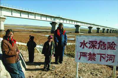 7月,雨季,沱沱河干枯的河床上一條黃毛狗在奔跑,不見(jiàn)寬廣河面,不見(jiàn)奔騰的河水,大地被烈日灼烤,裸露的河灘將水流分成幾股向東遠(yuǎn)去。全長(zhǎng)1389.6米的長(zhǎng)江源特大橋橫跨河上,橋北是江澤民題詞的“長(zhǎng)江源環(huán)保紀(jì)念碑”,橋南一塊警示牌字跡清晰,上面寫(xiě)著:“水深危險(xiǎn),嚴(yán)禁下河!
