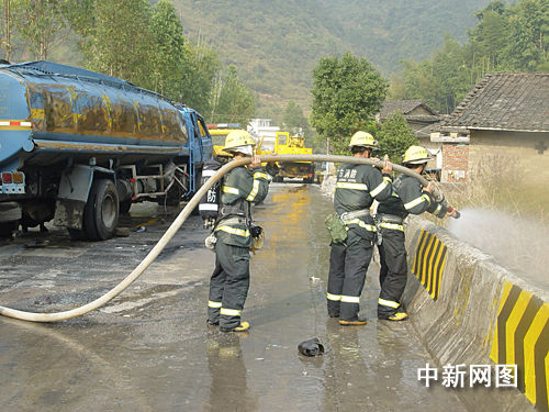 新豐縣公安局副局長陳如鋒組織交警很快封鎖了現(xiàn)場,實(shí)施交通管制。消防官兵穿上防化服,用兩臺消防車從河里抽水,用射水槍噴射側(cè)翻的槽罐車,迅速稀釋從車上流出的液體甲醛。吊車隨后趕到,工作人員帶上口照,冒著生命危險,靠近槽罐車,將側(cè)翻的槽罐車吊起,消防官兵繼續(xù)用射水槍向槽罐車猛烈射水。