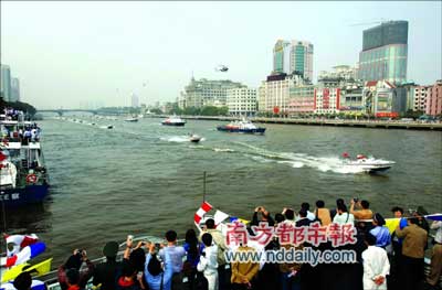 上午9時(shí)30分,演練正式開始。寬闊的江面上,12艘水警“獵鷹”系列快艇和12艘水警巡邏船組成的船艇單縱隊(duì),自西向東駛來?罩,廣州公安“天翼飛行隊(duì)”的3架警用直升飛機(jī)在船艇縱隊(duì)上方同步飛行。在警用直升飛機(jī)的配合下,12艘快艇變幻出4個(gè)“品字形”造型。