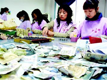 昨日下午,記者在公交公司收銀中心看到,10多名點鈔人員正在緊張清理各個公交線路收回來的大量零鈔,不到1小時,工作人員便清理出了一堆假幣、殘幣,其中還有游戲幣和冥幣。該中心主任林亞梅告訴記者,這都是一些惡意逃費的人干的,這些人在搭乘公交車的過程中,趁人多擁擠時,或?qū)垘啪沓梢粓F(tuán),或?qū)⒓賻叛杆偻度胂鋬?nèi),讓司機(jī)難以識別。更惡劣的是,個別人還使用游戲幣和冥幣充當(dāng)車費投放。林主任說,在上述逃費行為中,投放游戲幣多是頑劣的學(xué)生,而投放殘幣、假幣和冥幣者則是惡意逃費者,有時一天多的時間,清理出來的冥幣多達(dá)數(shù)十元。