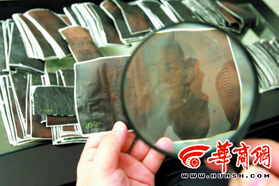 昨日下午,劉先生將粘貼好的“錢灰”送到人民銀行西安分行貨幣金銀處。暢繼達(dá)說(shuō):“我從事貨幣工作20余年,像老劉這樣將現(xiàn)金燒得如此嚴(yán)重,數(shù)額之大還是第一次見(jiàn)到!
