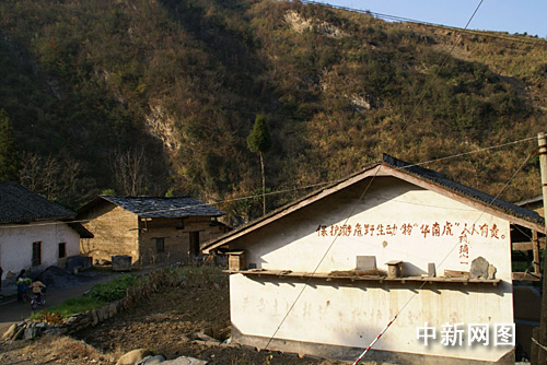 記者一行到達鎮(zhèn)坪縣曾家鄉(xiāng)時,發(fā)現(xiàn)公路邊一家玻璃廠的外墻寫著“保護瀕危野生動物‘華南虎’人人有責(zé)”的標語,這是記者在鎮(zhèn)坪縣發(fā)現(xiàn)的唯一一條保護華南虎的標語。