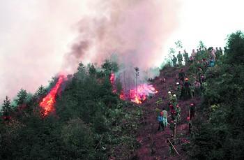 昨日上午9時許,大風(fēng)讓火勢再次蔓延。此時,600多名增援的武警、消防戰(zhàn)士、民兵預(yù)備役戰(zhàn)士迅速投入到山火的撲救之中。寬25米、長1公里的隔離帶剛剛砍伐成功,迅猛的火勢立即就蔓延過來。到上午11時,4條隔離帶相繼失守。常規(guī)的山火撲救方法已經(jīng)無法奏效,只得重新布置兵力。20米的隔離帶被拓寬到了25米,三組人員同時展開戰(zhàn)斗。記者在現(xiàn)場看到,附近許多村民已將自家的電視機、桌子、衣被等物什全部搬至空曠地。
