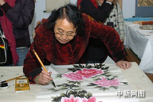 中新網(wǎng)11月28日電 今天下午,“第五屆網(wǎng)上河北行(邯鄲)”網(wǎng)絡(luò)媒體采風團來到邯鄲市邯山區(qū)渚河路街農(nóng)林二社區(qū)居民中心參觀。在才藝展示廳內(nèi),展柜上一件件精美小巧的自制手工藝品吸引了眾人的目光,紛紛向制作者請教制作過程。而一幅正在繪畫當中的牡丹圖,嬌艷欲滴,記者紛紛拍照留念。