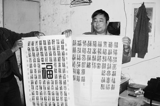 為了感謝退休教師對他的厚愛,僅有小學(xué)文化水平的男保姆放棄了工作,專心臨摹老先生的書法半年之久,并于幾天前獨自完成了一幅“百福圖”。
