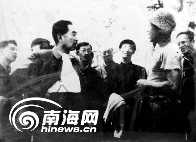 上午,身穿深灰色中山裝的周總理來(lái)到農(nóng)場(chǎng)橡膠園——這是儋縣愛國(guó)華僑1919年從南洋經(jīng)過(guò)千辛萬(wàn)苦引種成功的,叫“天任”、“蔡惠”膠園,它是新中國(guó)發(fā)展橡膠主要的采種基地。