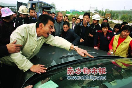 昨日上午10時(shí)許,鄭女士專程從香港趕往龍崗,在和參加開工儀式的員工碰面后,對(duì)他們簡單講了一段話,準(zhǔn)備帶著員工們進(jìn)入工地,但幾十名居民馬上沖上前,把他們截住,并大叫:“你們想干嗎,這是我們的地,不準(zhǔn)你們進(jìn)去!睘榱藬r住港商,一名男子從堆放木料的地方快速開出一輛白色轎車,停在入口處。