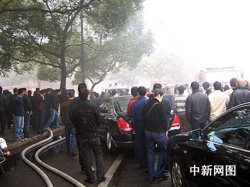 記者離火場五百米的溫州小南門即能聞到刺鼻的煙味,記者趕到現(xiàn)場時,已經(jīng)有十幾輛消防車及救護(hù)車到場,街道上到處是水,留下滅火后的痕跡。目擊者告訴中新社浙江分社記者,火是從一樓東面的花店開始的,隨后蔓延到二樓;記者看到著火的溫富大廈二樓是一家娛樂城,娛樂城正不斷往四周冒著濃煙,還有消防車架起云梯從東面和南面用高壓水槍往著火樓層里噴水滅火。