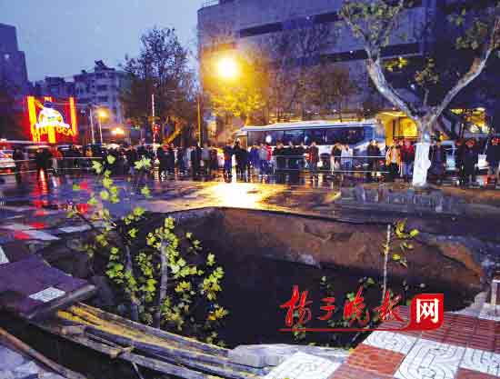 由于路面塌陷,暴露在坑口部位的煤氣管道和水管處于懸空狀態(tài),已經(jīng)“彎了腰”,為防管道扭曲引發(fā)斷裂,甚至再出現(xiàn)二次事故,地鐵施工方立即組織人員用鋼筋支撐管道。很快,一輛翻斗車(chē)運(yùn)來(lái)一斗沙包,幾十名工人將近百袋沙包填了進(jìn)去,但坑內(nèi)竟聽(tīng)不到聲音,好像“無(wú)底洞”。為了安全,幾十名工人被緊急撤出現(xiàn)場(chǎng)。大坑南側(cè)兩米遠(yuǎn)的綠化島上有一棵成年大梧桐,記者設(shè)法接近洞口進(jìn)行拍照,于是來(lái)到那棵大樹(shù)下,料想靠著它是安全的。剛拍完一張照片后,兩名救援人員立即攆走記者。5點(diǎn)49分,“轟”的一聲響,現(xiàn)場(chǎng)跟著傳出一陣驚訝聲,記者原先依靠著拍照的那棵樹(shù)掉了下去,綠化島也塌陷了一段,驚得記者出了一身冷汗:乖乖,若剛才遲走片刻,后果難料!此時(shí),現(xiàn)場(chǎng)的警察和保安嚴(yán)厲疏散圍觀(guān)人員,警戒線(xiàn)又隨著擴(kuò)大了一圈。6點(diǎn)11分,又是一聲轟響,大坑西側(cè)的一棵樹(shù)也塌陷進(jìn)坑,樹(shù)旁的一對(duì)垃圾桶也不見(jiàn)。此時(shí),警戒線(xiàn)又大了一圈,記者很快從交管部門(mén)獲悉,漢中路東向西實(shí)行全封閉,公交車(chē)、私家車(chē)全部從周邊上海路、牌樓巷等處繞行,西向東只剩下兩股車(chē)道,何時(shí)恢復(fù)要看搶修進(jìn)度。