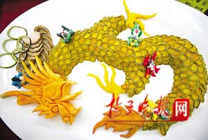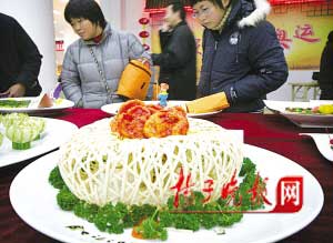 走進展廳,記者就被展臺上的菜肴所吸引。在比“雕工”的展區(qū),南瓜、蘿卜、山芋等普通蔬菜被廚師們用妙手雕刻成龍、鳳、仙子等各色造型,刻工精細,龍須、鳳尾上的羽毛,甚至是一根根的。已有10年廚齡的宋師傅告訴記者,作品里除了南瓜、還有紅、青蘿卜、山芋等食材,一共刻了三個小時才完工。在比“擺盤”的展區(qū),不少菜肴都是以奧運為主題,用面條搭建的“鳥巢”體育場,形象逼真。用白色白玉糕、綠色麥香糕、糯米元宵擺出的五環(huán)體育場惟妙惟肖,“操場”外五位用糯米做的福娃更是可愛喜人,據(jù)介紹,從蒸糕點到擺盤,廚師一共花了九小時呢,香噴噴的米糕看著都眼饞。