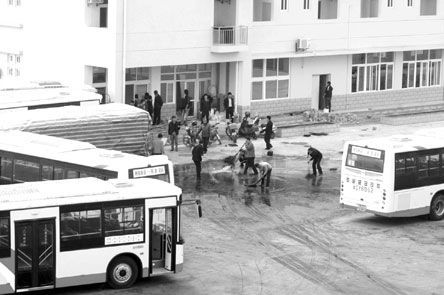 記者在現(xiàn)場附近一高樓上看到,停車場內(nèi)一角落邊停放著四輛公交車,有的車玻璃已碎裂,車上可明顯看到被火燒過的痕跡。場內(nèi)幾名工作人員推著板車在運一些烏黑的物體,十個人在幾輛公交車圍起的地方忙著清洗烏黑的地面,旁邊還停著一用塑料布包裹嚴(yán)實的物體。場內(nèi)有人發(fā)現(xiàn)記者在拍攝,又叫來一部公交車將清洗的地方圍起來。
