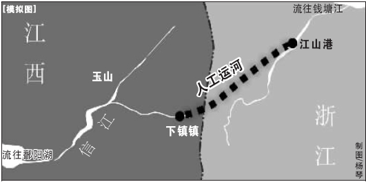 浙贛兩省山相連、路相通,水卻不對流。發(fā)源于浙贛兩省交界懷玉山的信江,是鄱陽湖水系五大河流之一,全長351公里,經(jīng)上饒、鷹潭等縣市注入鄱陽湖。規(guī)劃中的浙贛人工運河是指,從錢塘江的上游——浙江省江山市江山港至上饒信江之間修建一條人工運河,從而達到錢塘江與鄱陽湖貫通的目的。