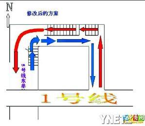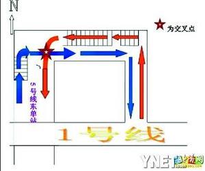 為了讓大家能對這一問題有直觀的認(rèn)識,“cjg9527s”制作了兩張圖發(fā)在網(wǎng)上。第一張圖是目前東單地鐵站換乘通道的設(shè)計圖,另外一張則是他修改之后的東單地鐵站換乘通道的通行圖。第一張圖上可以清晰地看到,由于從1號線通往5號線的兩部電梯和從5號線通往1號線的扶梯設(shè)置在靠墻的同一側(cè),所以兩股換乘人流勢必會在5號線進站口附近交叉。