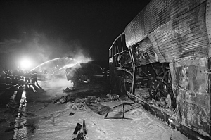 運輸車是一輛掛遼寧牌照的雙層東風運輸車,車上滿載了小轎車。據(jù)目擊者介紹,事發(fā)前運輸車加完油準備出站,向北轉(zhuǎn)彎時,遭油罐車追尾,兩車隨即起火。消防人士透露,運輸車載的8輛小轎車只保住了兩三輛。