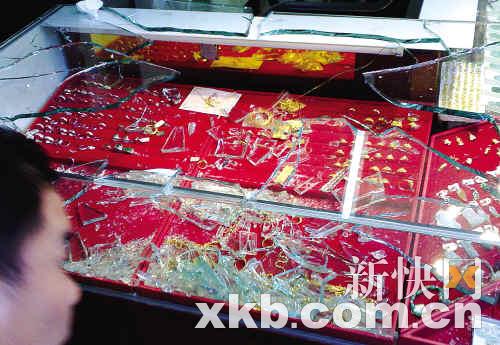 劫匪砸破柜臺(tái)玻璃搶走部分金飾。(目擊者供圖)