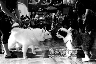 現(xiàn)場一下子要請來幾十名狗狗,真不容易。狗主們各顯神通,有的拿包包當(dāng)工具,有的直接抱進(jìn)來的,訓(xùn)練有素的狗狗則直接跟在主人后面閃亮登場了。它們在現(xiàn)場看到這么多同類,都好奇地互相打量,小心翼翼地上前用鼻子嗅嗅,算是問個(gè)安了。