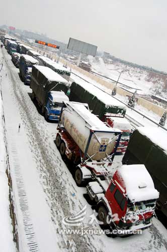 1月15日早上,記者趕往九江長(zhǎng)江大橋,只見(jiàn)各種車輛在高速公路上排起長(zhǎng)龍,一直延伸到沙河段。武警九江支隊(duì)直屬大隊(duì)謝隊(duì)長(zhǎng)告訴記者,14日早上,該大隊(duì)派出了100多名武警官兵,并拉來(lái)100多車砂石鋪在橋面上。在交警的指揮下,200余輛車緩緩?fù)ㄟ^(guò)。但由于14日晚10點(diǎn)左右雪越下越大,橋面又開(kāi)始結(jié)冰,15日凌晨1時(shí)左右,交警再次封橋,上萬(wàn)輛車堵塞在昌九高速公路上及九江市區(qū)邊緣。
