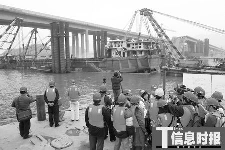 據(jù)悉,橋體拆除工作的第一階段工作包括穩(wěn)定墩、支架墩、牽制墩、臨時(shí)墩及牽引穩(wěn)定體系等。記者昨天現(xiàn)場(chǎng)看到,第一階段穩(wěn)定墩、支架墩的全部施工工作已完成,主牽引墩、1#、2#、3#牽制墩,1#、2#、3#臨時(shí)墩的承臺(tái)也全部完成,1#、2#、3#臨時(shí)墩鋼橫梁也均已至位,即將安裝到位。切割船體移開后,坍塌斜梁將會(huì)通過(guò)牽引系牽制穩(wěn)定,分塊切除清理,“除了斜梁段將會(huì)被切斷拆除外,緊接斜梁的橋身也要被切除一部分,長(zhǎng)度大約為88米,這項(xiàng)工作我們力爭(zhēng)用兩個(gè)月時(shí)間清理完善!