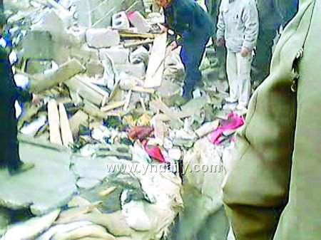 “嘭”的一聲巨響,木板、竹竿、瓦礫、水泥渣四處橫飛,嗆人的火藥味中,帶血的斷手?jǐn)嗄_散落在地……昨日上午10時(shí)30分,昭通市鎮(zhèn)雄縣果珠鄉(xiāng)果珠村街上社拱橋村民小組,一家庭式土制爆竹作坊,在用火藥生產(chǎn)爆竹過程中,發(fā)生爆炸,作坊主人劉龍春及其舅子、丈母娘不幸被炸得血肉模糊,當(dāng)場(chǎng)身亡,劉龍春的媳婦和四哥傷勢(shì)嚴(yán)重,被及時(shí)送到醫(yī)院救治。事發(fā)后,當(dāng)?shù)乜h、鄉(xiāng)兩級(jí)政府及有關(guān)部門迅速趕到現(xiàn)場(chǎng),指揮人員排除二次爆炸隱患。