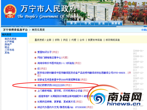 。êD希┤f寧市政府人民網(wǎng)站居然有迷幻藥的供求信息”。今日下午5時許,一網(wǎng)友向本網(wǎng)來電稱。記者立即打開萬寧市人民政府的網(wǎng)站,驗實了該網(wǎng)友報料的真實性。