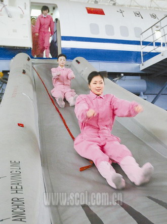 緊急撤離訓(xùn)練廳。廣播中傳出急促的警報(bào)聲,教員發(fā)出“緊急撤離”指令,此刻模擬艙內(nèi)濃煙彌漫,學(xué)員們立即行動(dòng)起來,打開充氣滑梯,然后抬起雙手,將身體彎成90度直角跳出機(jī)艙,從滑梯上滑下。充氣滑梯大約有四層樓高,跳下去對(duì)一些膽小的人來說是需要勇氣的。楊麗忘不了自己剛開始的狀況。20歲的楊麗身材高挑,面容清秀,從小嬌生慣養(yǎng),是爹媽的掌上明珠。那天楊麗聽到老師發(fā)出“一、二、跳”的指令,雙腿軟了,眼淚奪眶而出,持續(xù)了三分鐘。老師大聲吼道:“楊麗,快跳!”面對(duì)四層樓高的滑梯和嚴(yán)厲的訓(xùn)斥,楊麗越發(fā)害怕起來?拗鴳┣罄蠋煟骸澳懿荒懿惶,我害怕……”沒等楊麗說完,老師便將她甩下機(jī)艙,這時(shí)楊麗雙手緊緊抓住艙門旁邊的鋼管,雙腳懸在滑梯上拼命地掙扎,大喊:“救命啊,救命啊!”現(xiàn)在她完全適應(yīng)了。