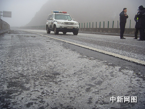 記者同時看到,路面的冰凍足有五、六厘米厚,幾臺推土機(jī)正在進(jìn)行破冰作業(yè)。但據(jù)稱收效不是很大。而在廣東京珠北樂昌云巖路段,路面結(jié)冰最厚的近二十厘米。