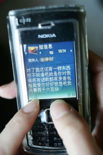 1月28日,麗娜的手機(jī)突然收到了一條短信:“我這有一樣你的東西,你不知道吧?就是你對(duì)我說的所有話我都有錄音和視頻,包括咱們?cè)谝黄稹痢,你好好想想吧!我只?600塊錢!丙惸瓤吹竭@則短信后非常害怕,就打電話給王剛,希望他不要有過激行為,但王剛說如果不給錢,就讓全世界都知道麗娜的“丑事”。