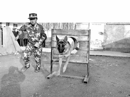 搜救犬隊是一個獨立的小院,里面有4間嶄新的狗舍,還有一個小型的訓練場?吹侥吧耍瑑蓷l體格威猛、面目猙獰的大犬趴在狗舍的鐵柵欄上,炸雷般地吼叫著,讓人望而生畏。身著軍裝的馴導員走上前去,兩條大犬馬上變得溫柔起來,像可愛的小孩子,毛茸茸的大頭在馴導員的手上蹭來蹭去。