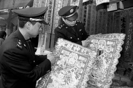 執(zhí)法人員立即讓該店停止銷售行為,質(zhì)問其是否知道把人民幣圖樣印在年畫上是違法行為時,店家連說不知道,說年畫上印上人民幣就圖個吉利。在隨后的檢查中,執(zhí)法人員發(fā)現(xiàn)許多年畫上都印有人民幣圖樣,而店家卻無一知曉這是違法行為!拔覀冎皇怯X得吸引客人,大家都圖個財源滾滾,真不知道這是違法的!币患夷戤嫷甑膹埿绽习逭f。