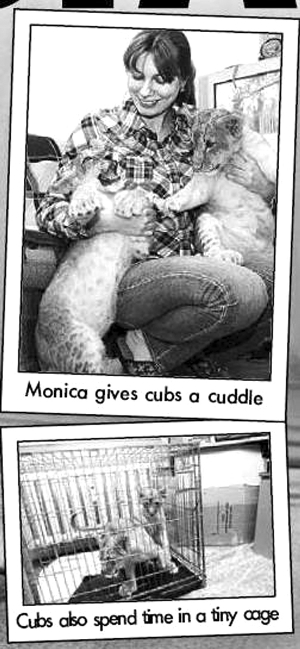 但2007年圣誕節(jié)早上,莫妮卡打開房門時(shí)目瞪口呆地發(fā)現(xiàn),這次陌生人遺棄在她家門口的動(dòng)物,竟然是2頭剛出生的獅子!2只小獅崽被裝在一個(gè)小紙盒子中,渾身凍得瑟瑟發(fā)抖。它們可憐巴巴地望著莫妮卡,就如同2只溫順的小貓。莫妮卡頓生憐愛之心,立即將它們抱進(jìn)家中取暖。