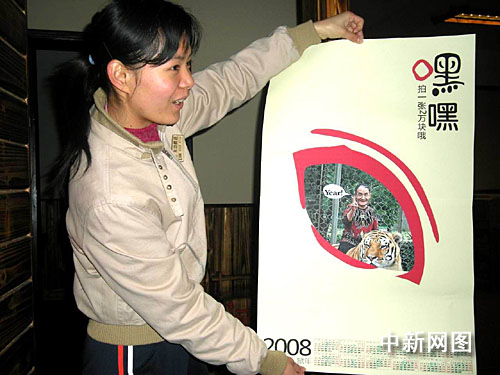 記者看到,網(wǎng)友“小二黑”的“周老虎年畫”作品非常簡(jiǎn)潔、有趣,頗具幽默和滿諷刺。年畫左上角寫著“黑嘿,拍一張2萬元”,中間是身材瘦小、眉開眼笑的周正龍騎在一只老虎背上,揮手致意,下面是2008年的日歷。