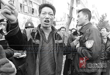 據(jù)李賢堂說,其家兄弟4人來昆明已有多年。二哥李賢友以前受過傷,醫(yī)治好后便身帶殘疾,與二嫂在昆明做米線生意。上午10點左右,他知道二哥送餌塊途經(jīng)人民東路時被城管打了,就迅速跑了來!翱吹蕉缣稍诘厣,餌塊散落一地,我就跑到一輛白色面包車前,攔住去路,沒想到,七八個男子就過來打我,他們那么多人,我咋個還手,打得我頭昏眼花,我只好抓住先打我的那個不放手!