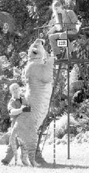 該動物園內(nèi)的一只成年獅虎獸“赫拉克勒斯”目前已經(jīng)長到3.7米長,體重超過了500公斤!當(dāng)動物園的馴獸師奇娜·約克給“赫拉克勒斯”喂食時,盡管她站在了一個4米多高的支架上,但“赫拉克勒斯”仍輕易地站起了整個身子,并抓取到了奇娜手中的食物。雖然美國邁阿密稀有瀕危物種協(xié)會的環(huán)保專家布哈加文·安特爾博士仍勇敢地站在它身邊,但安特爾的身高只有“赫拉克勒斯”的一半。