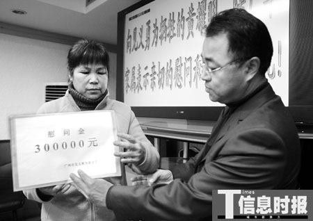 默哀、掌聲獻(xiàn)給見義勇為犧牲勇士;榮譽(yù)證書、獎勵存折送給勇士牽掛的家人。廣州去年10月起正式提高對市民見義勇為傷殘犧牲獎勵慰問金額度,昨日,最高獎勵30萬元首次各頒發(fā)給兩名犧牲者。家屬們代收榮譽(yù)證書和首次以存折形式發(fā)放的獎勵金,都表示倍感安慰。