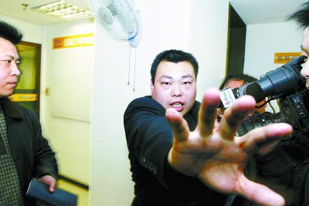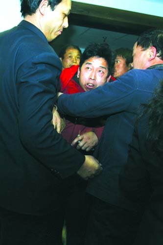 站在門外的十幾個民工看到保安動手推搡記者,就闖了進(jìn)來。一穿紅色夾克的民工兩手作揖,幾次跪到地上,說“要打你們打我吧,不要打人家記者”。