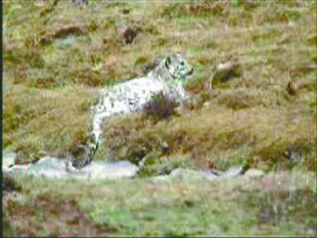 目的地距離真達(dá)鄉(xiāng)政府有四五十公里,海拔為3900米~4000米,汽車并不能直達(dá),在換乘了摩托車和馬,又步行了一段路后,一行人果然有重大收獲:大老遠(yuǎn),他們就看見一只雪豹趴在溝邊,借著三四十厘米高灌木的掩護(hù),他們悄悄往溝邊挪去。這只雪豹身長一米多,由于距離太遠(yuǎn),相機(jī)幾乎不能發(fā)揮作用,黃勇便接過DV,將鏡頭對準(zhǔn)它,拉近、再拉近……“最近時,我們和它相距只有十多米,”黃勇說,當(dāng)時他們心里發(fā)虛,好在周圍有羊的尸體,估計雪豹剛填飽了肚子,而且它在起身離開的途中,遭遇了三頭牦牛的圍攻,旁邊還有一群馬,“馬也在攆它”。雪豹雖然早就發(fā)現(xiàn)有人一路跟隨,但無暇顧及。由于寡不敵眾,雪豹?dú)獯跤醯財∠玛,悻悻地向海拔更高的地方走去,“別看它并沒有跑,我們跟在后面卻是累得夠嗆!