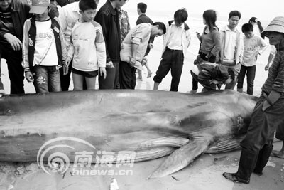 3月11日凌晨4點(diǎn)多鐘,文昌市錦山鎮(zhèn)富宅村村民老韓在潮灘港附近海邊,發(fā)現(xiàn)一條因落潮而擱淺死亡的鯨魚(yú)。