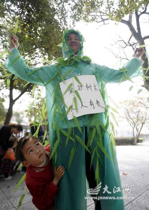 據(jù)了解,這群青年志愿者希望通過行為藝術(shù),呼吁人們保護(hù)植物,愛護(hù)環(huán)境。他們從頭到腳用綠色塑料雨衣和塑料花、塑料枝葉裝扮成大樹和花朵。組織者告訴記者,全球環(huán)境變得越來越惡劣,如果大家不愛護(hù)樹木,將來人類只能用塑料花、塑料樹來替代。(李偉 梁冰 李慧)