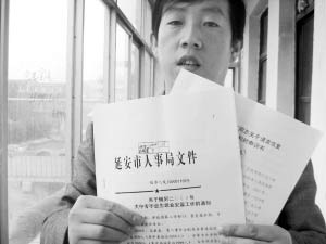 楊延?xùn)|拿著延安市人事局的文件喊冤。