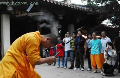 事件實(shí)錄:“哇,鐵條斷了、三根都斷了!”,在泉州南少林寺大殿廣場前,圍成一圈的觀眾群中響起了一陣陣驚嘆聲。幾分鐘前,在眾多媒體及游客面前,泉州南少林寺弟子釋振明在短暫的凝神運(yùn)氣后,用頭撞向鐵板。一撞之下,三條規(guī)則疊放在一起、半米長、總厚度達(dá)1.5厘米的鐵條瞬間碎成了四五截、飛出四五米開外。在這一手高超的“鐵頭功”面前,幾位小朋友驚奇得連嘴都沒合上。