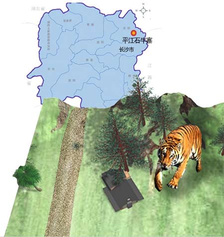 2006年10月30日,平江縣虹橋鎮(zhèn)洞口村七星巖電站閃石巖驚現(xiàn)虎蹤。據(jù)目擊者魏強(qiáng)根說(shuō),該動(dòng)物體長(zhǎng)約1.3米以上,渾身是條形斑紋,在地上留下的足印有10多公分寬。
