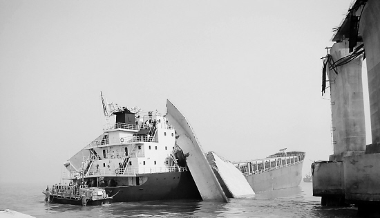 昨天凌晨,一艘臺(tái)州籍貨輪撞上了施工中的金塘大橋。兩塊重達(dá)3000多噸的鋼筋混凝土砸在了貨輪的駕駛艙上。