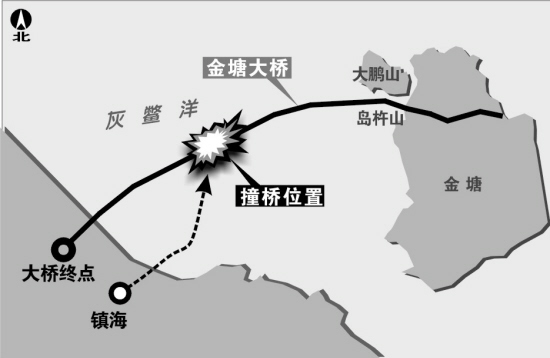 “沒(méi)想到,船會(huì)撞到非通航孔上!”舟山連島工程建設(shè)指揮部鄭為成副書(shū)記介紹說(shuō),金塘大橋位于舟山金塘島與寧波鎮(zhèn)海之間,航運(yùn)異常繁忙,因此大橋設(shè)有三個(gè)通航孔,其中主通航孔橋高51米,可以通過(guò)5萬(wàn)噸級(jí)的輪船,即使兩艘萬(wàn)噸輪船也可以并排通行。