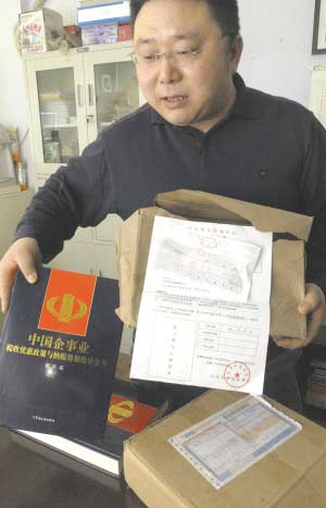 昨日上午,在豐樂(lè)五金機(jī)電城東南一消防器材店,商戶胡先生拿出兩本天價(jià)書(shū),滿臉愁苦。這兩本書(shū)的書(shū)名為《中國(guó)企事業(yè)稅收優(yōu)惠政策與納稅籌劃指導(dǎo)全書(shū)》。